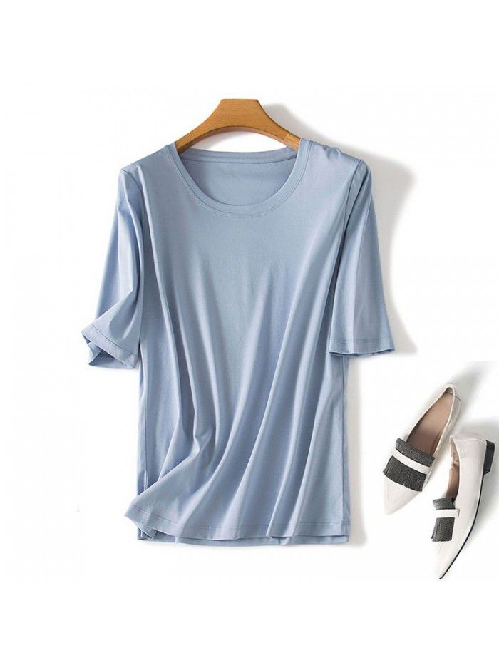 New autumn mercerized cotton medium sleeve round neck t-shirt for women's pure cotton white quarter sleeve thin bottom T-shirt
