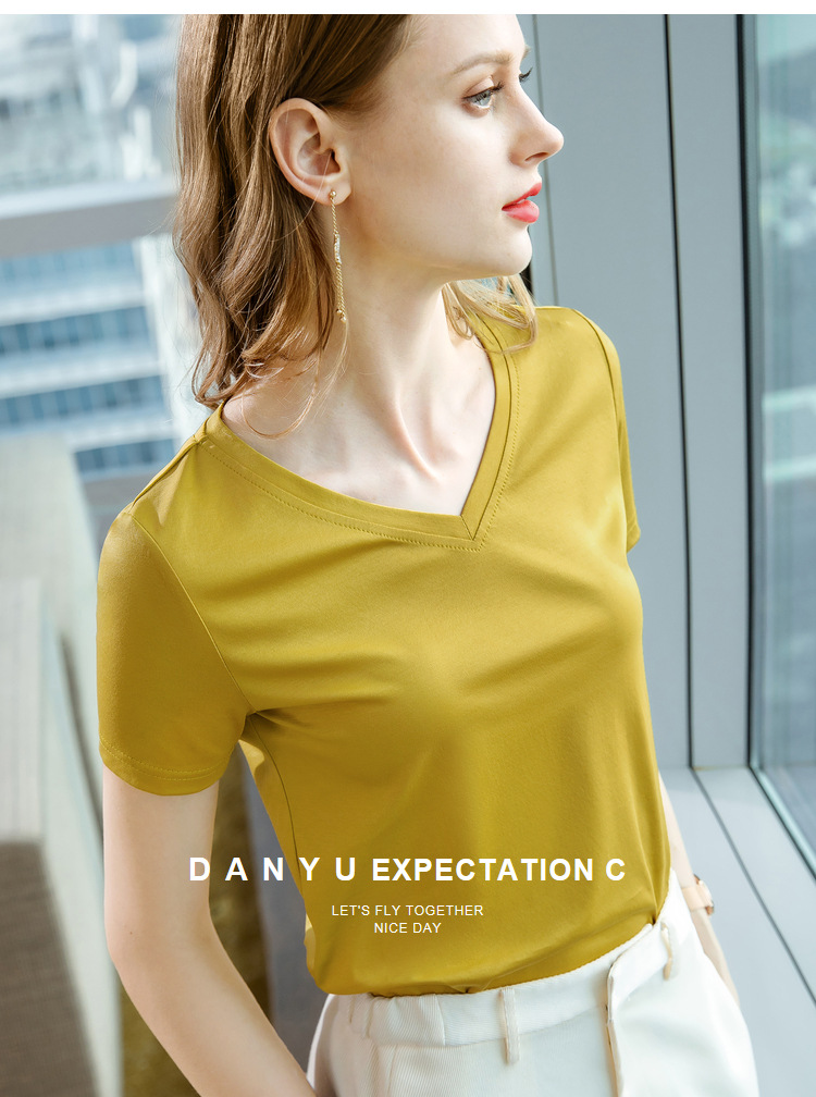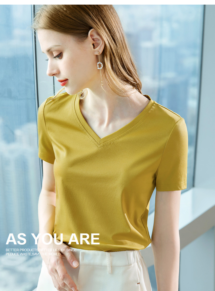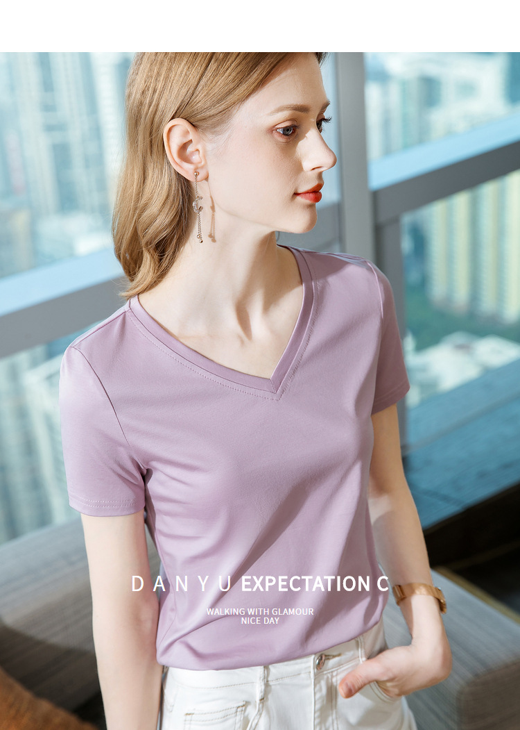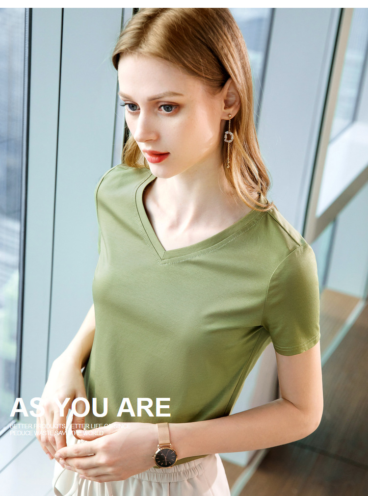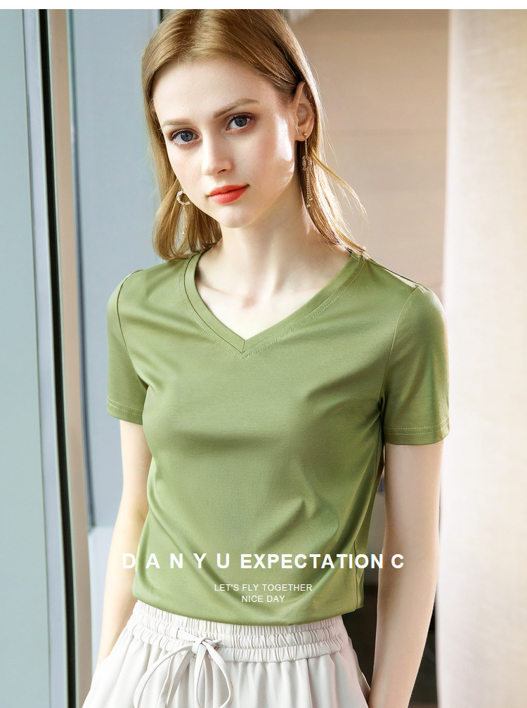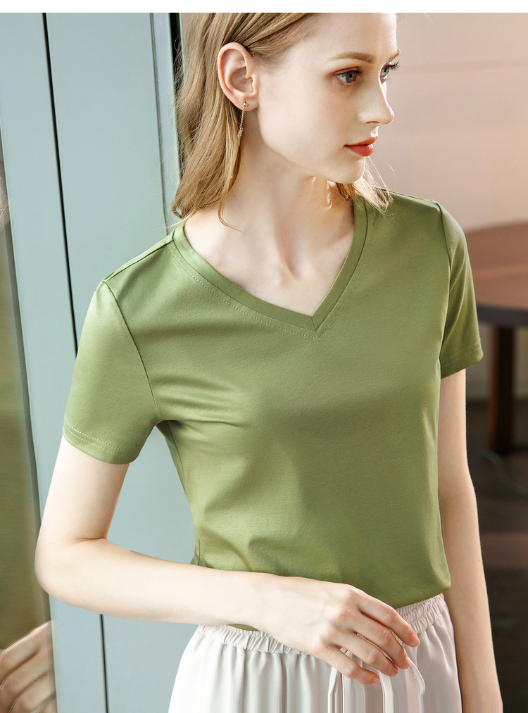 Ice feeling mercerized cotton short-sleeved t-shirt women's new style women's temperament v-neck pure cotton t-shirt pure color high-grade top