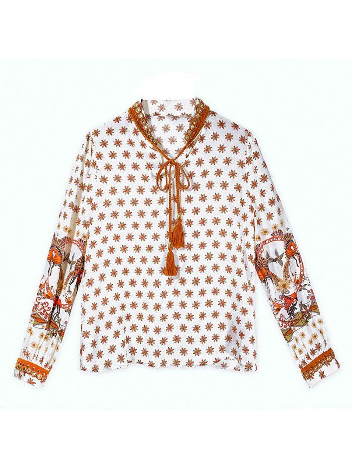 Silk shirt women's spring and summer new printing small stand collar palace style mulberry silk top design