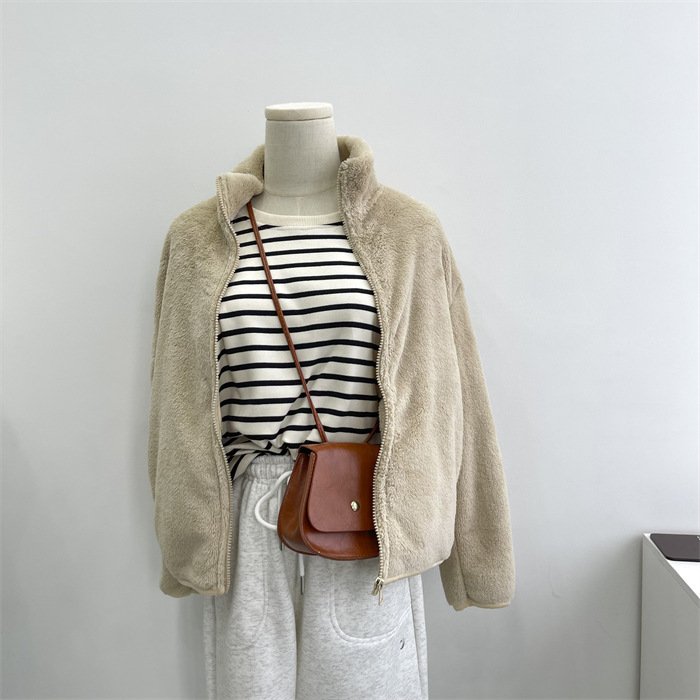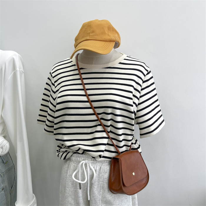 Plush matte striped round neck short sleeved T-shirt for women's spring loose beige apricot stripe bottom top