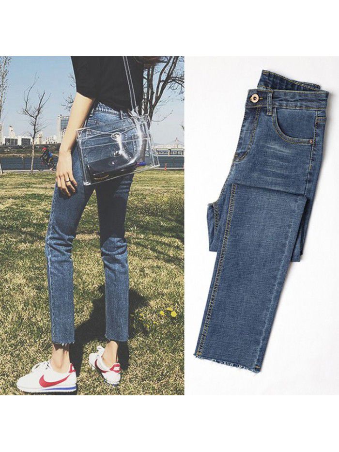 Straight jeans women's high waisted slim stretch nine point loose versatile eight point Korean retro light blue wide leg pants