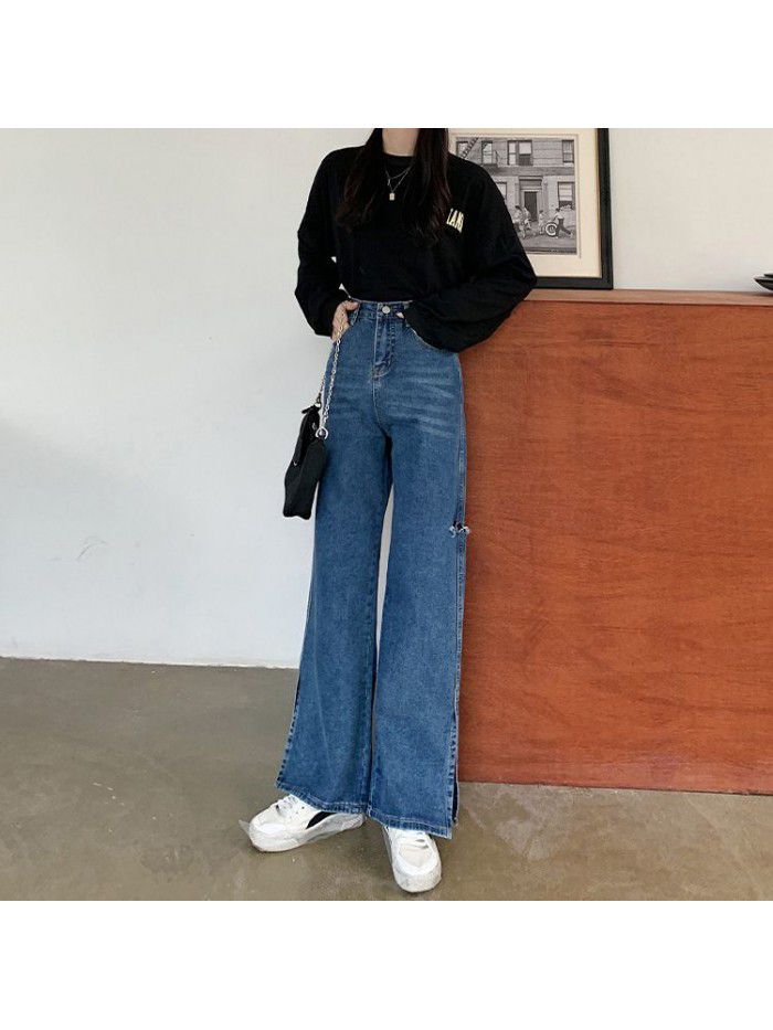 Real shot pierced jeans straight tube Wide Leg Jeans small elegant drop loose split floor pants