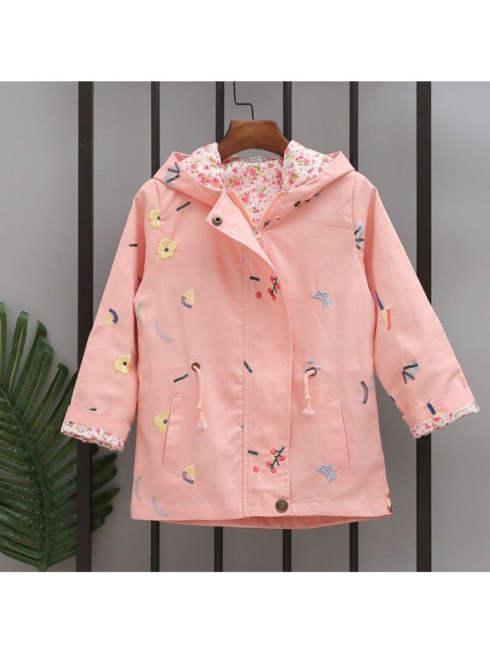 Spring Girls' All Cotton Flower Embroidered Windbreaker Drawstring Hooded Mid length Coat Top