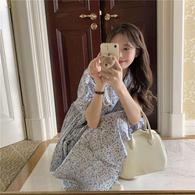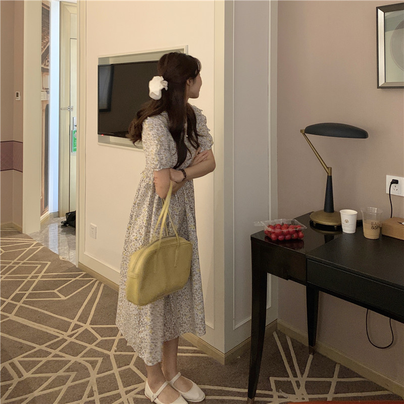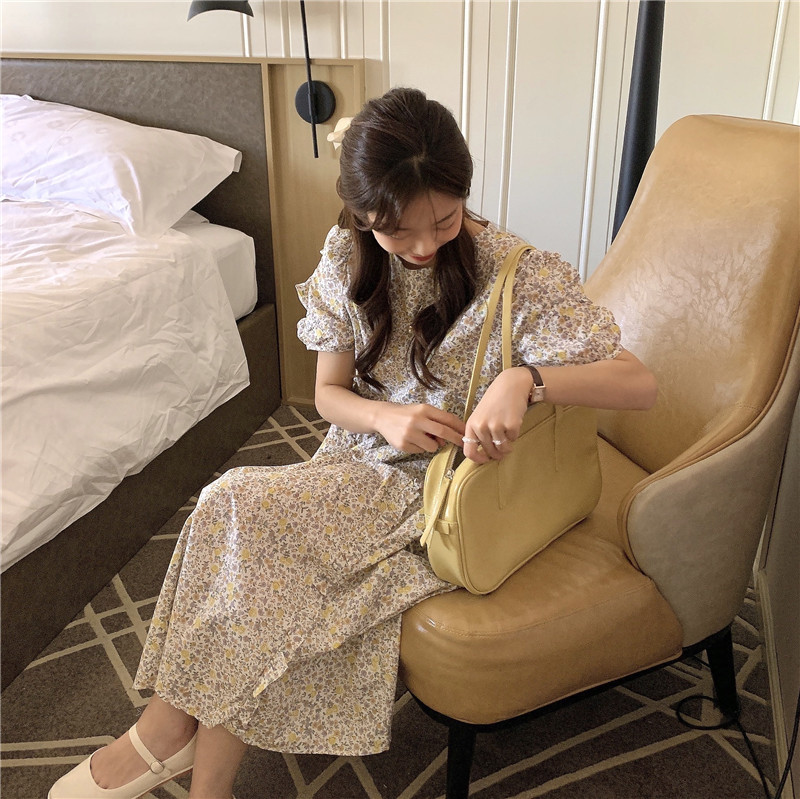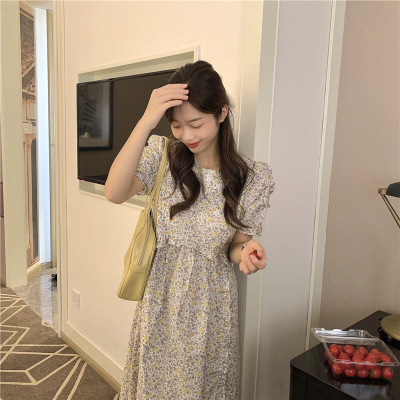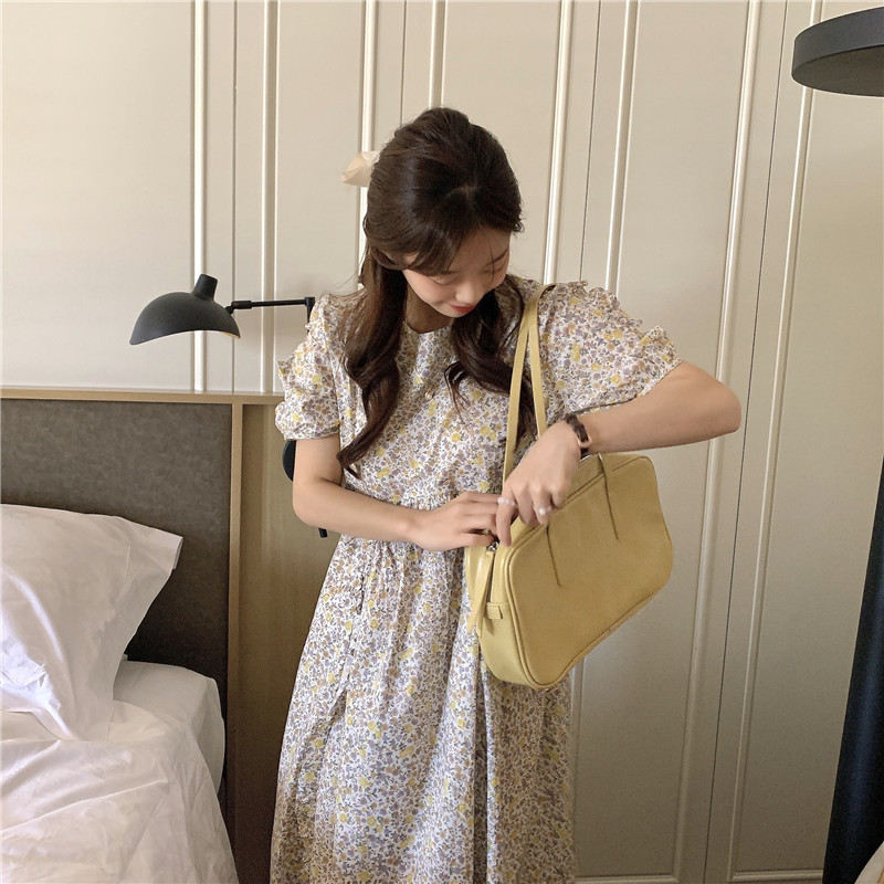 Floral dress women's spring and summer new gentle temperament French retro bubble sleeve loose slim mid length dress