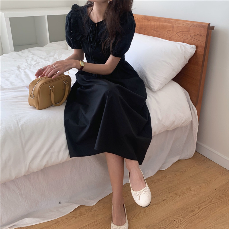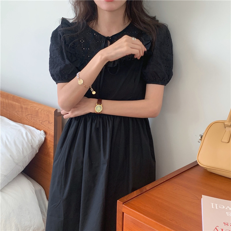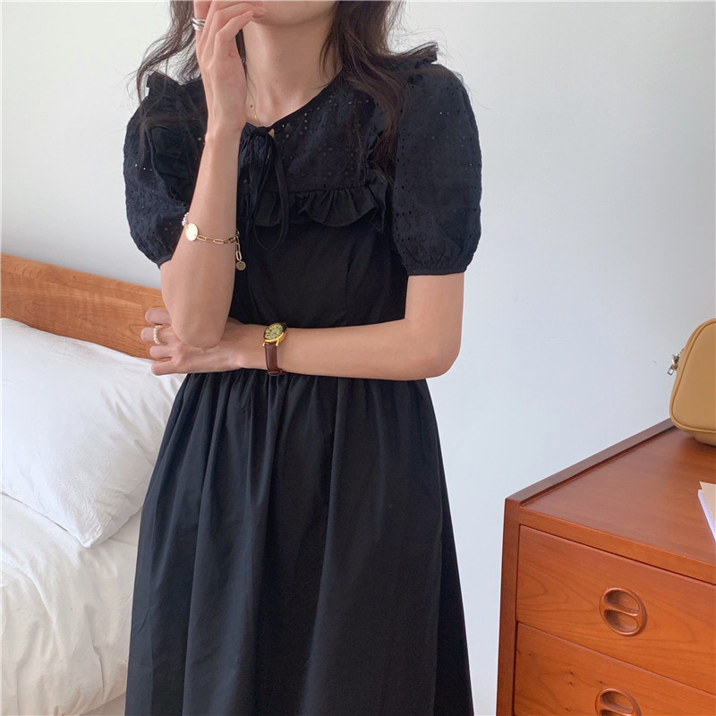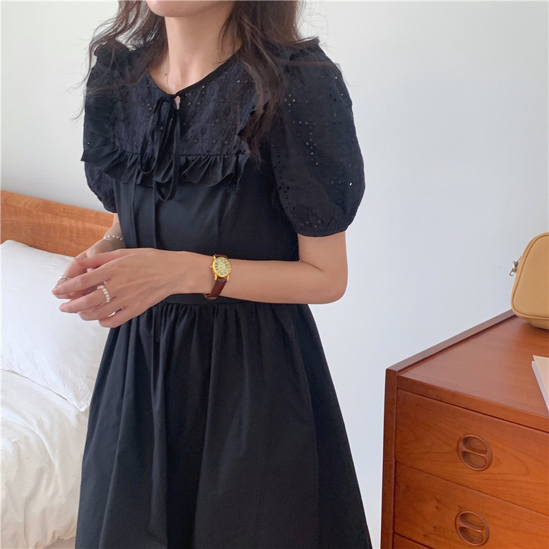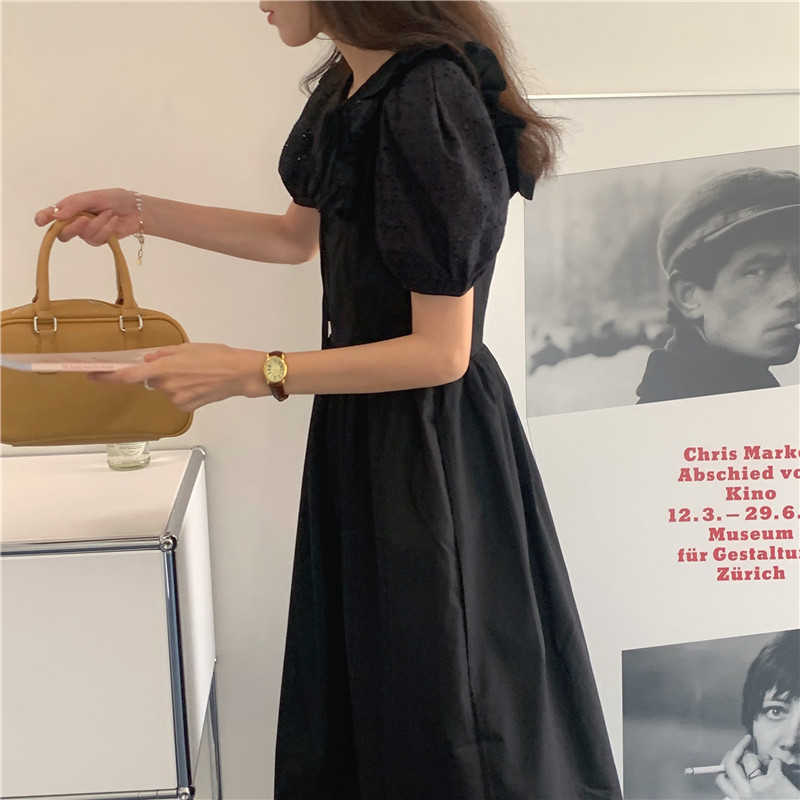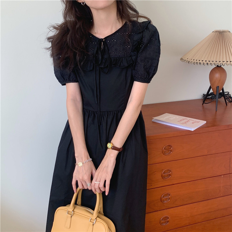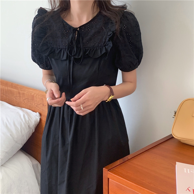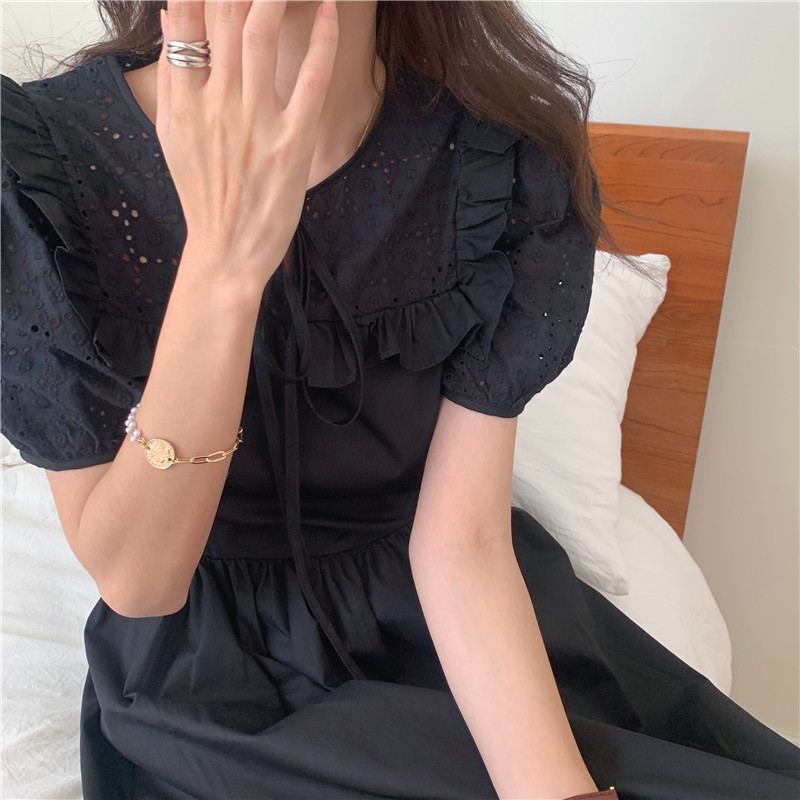 Soft wind cut-out lace dress women's French temperament bubble sleeve waist length black skirt summer