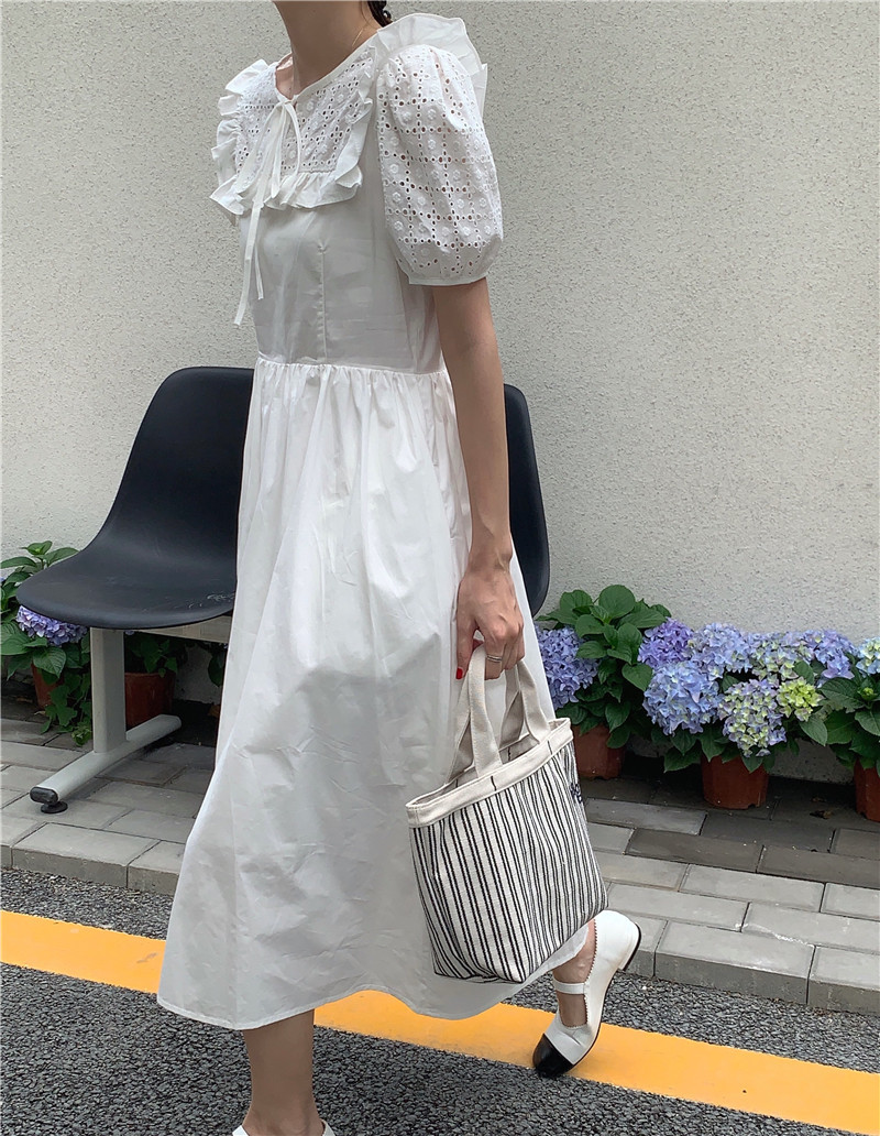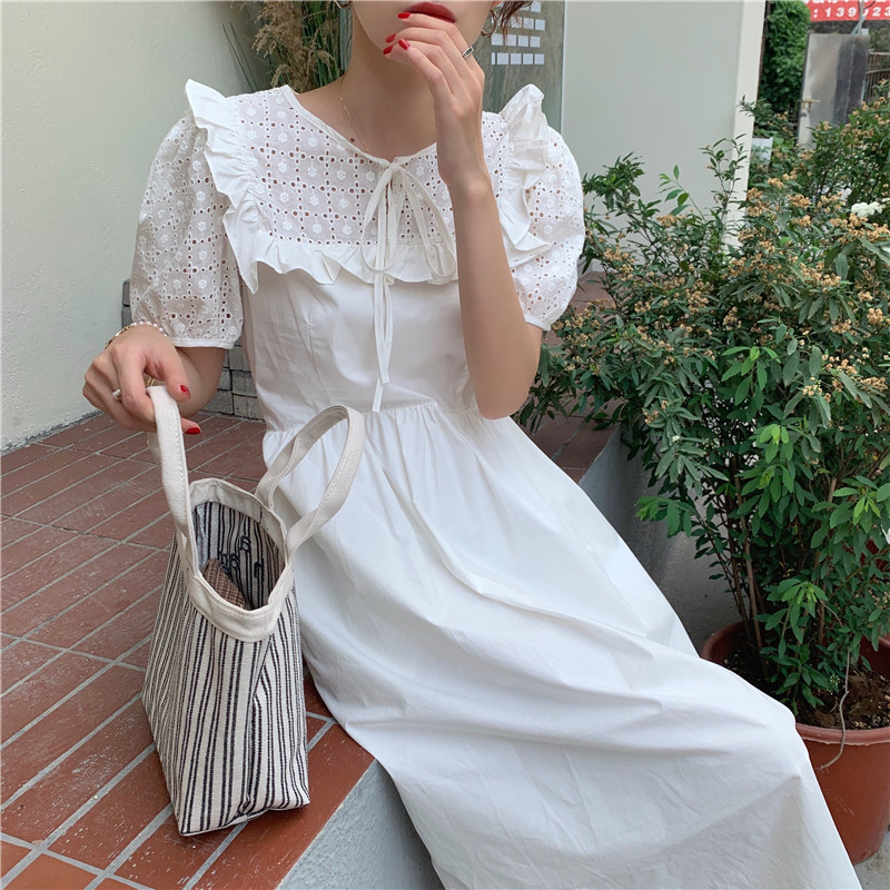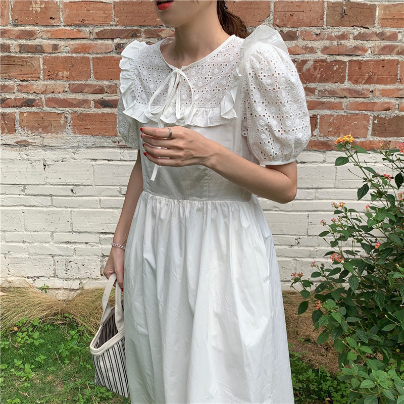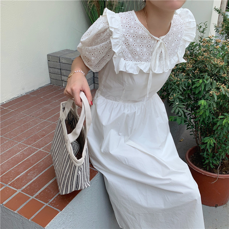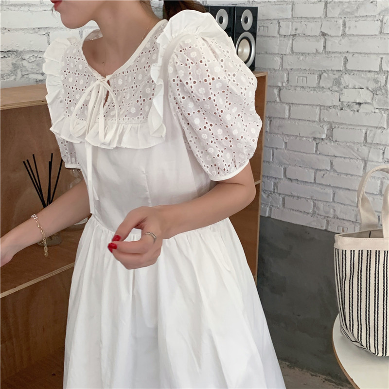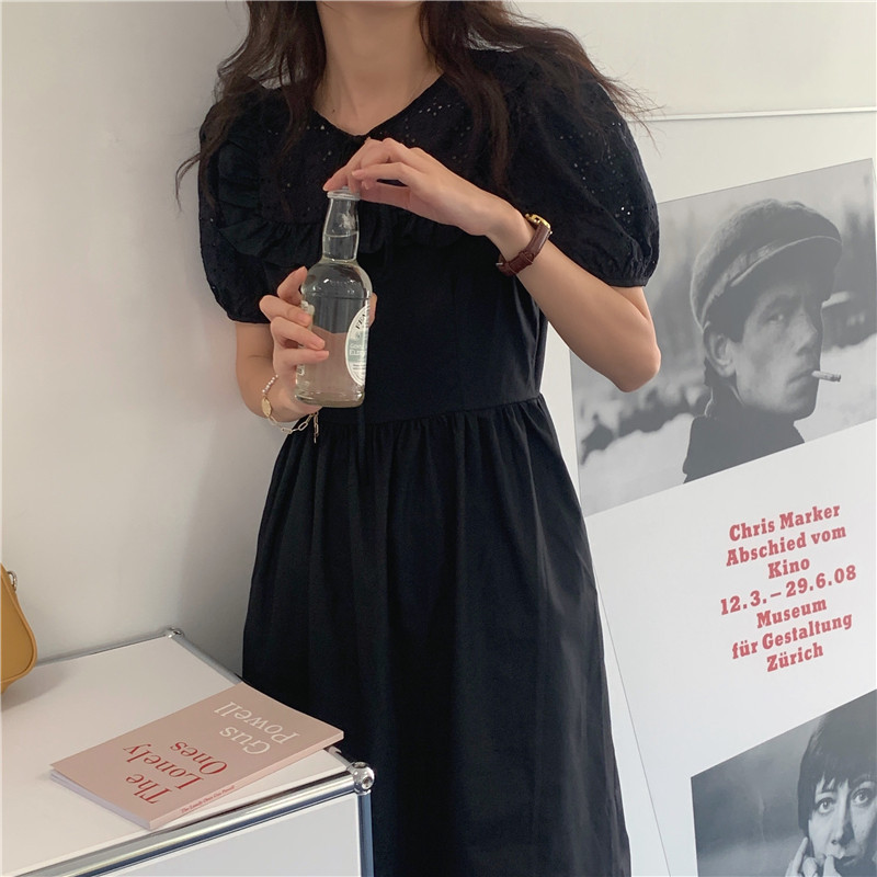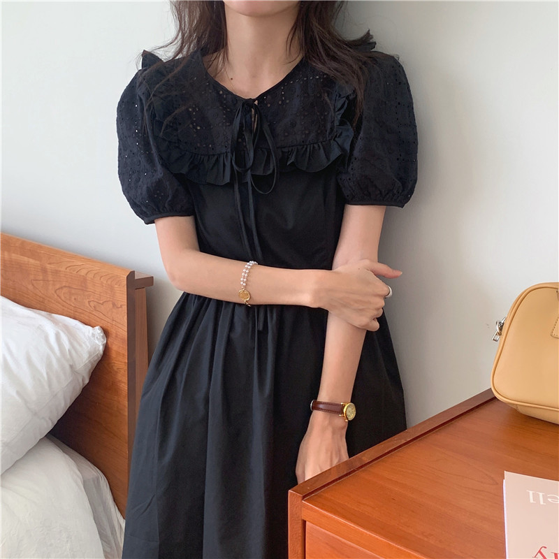 Soft wind cut-out lace dress women's French temperament bubble sleeve waist length black skirt summer