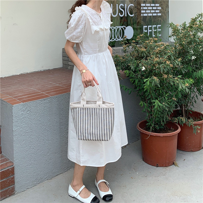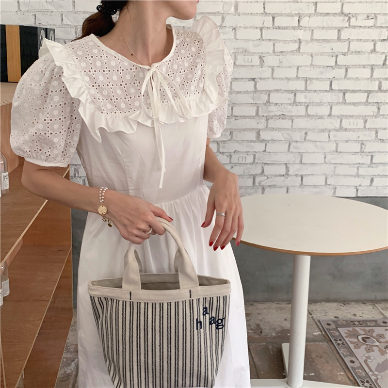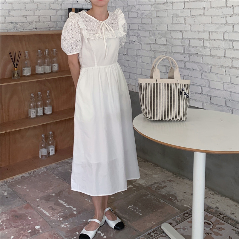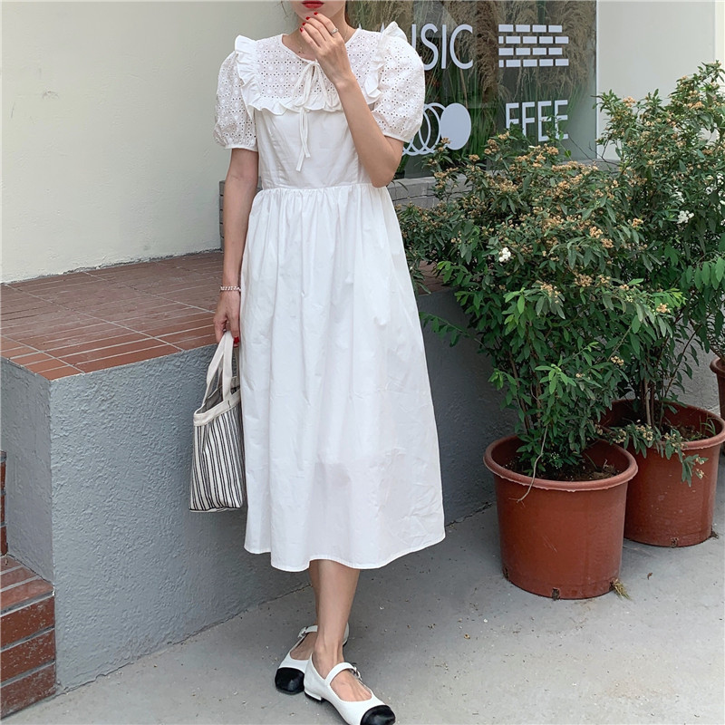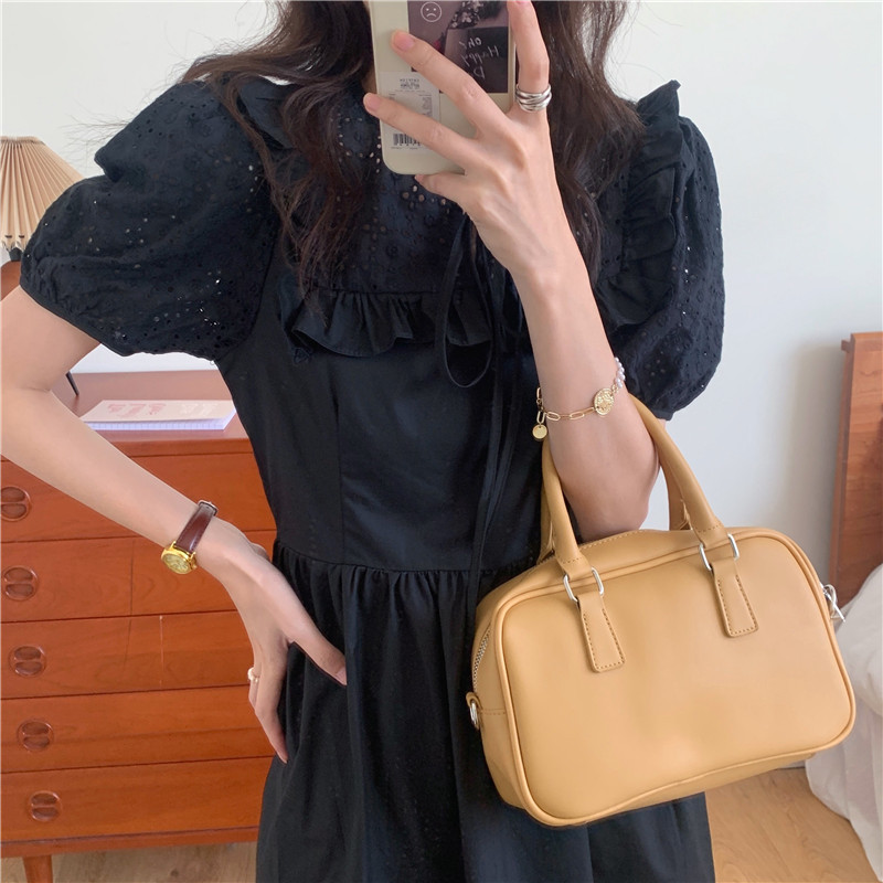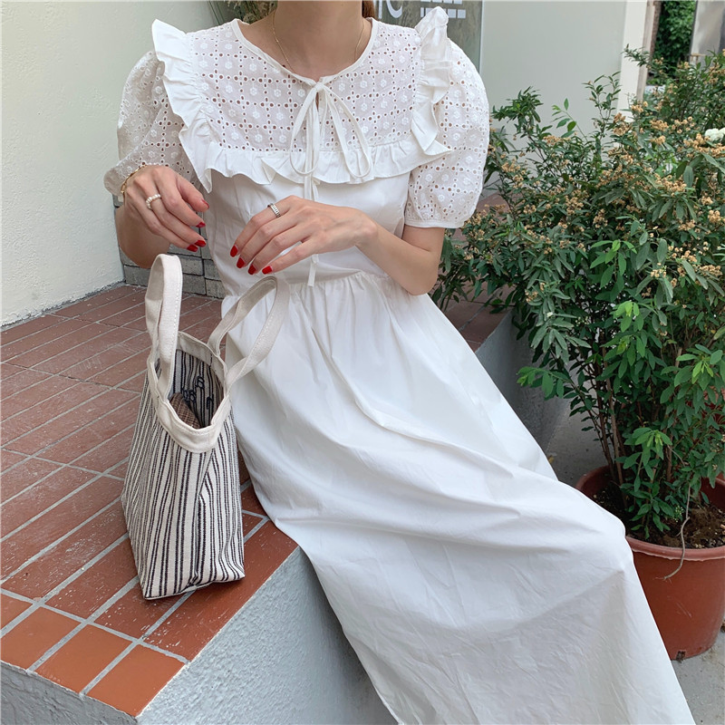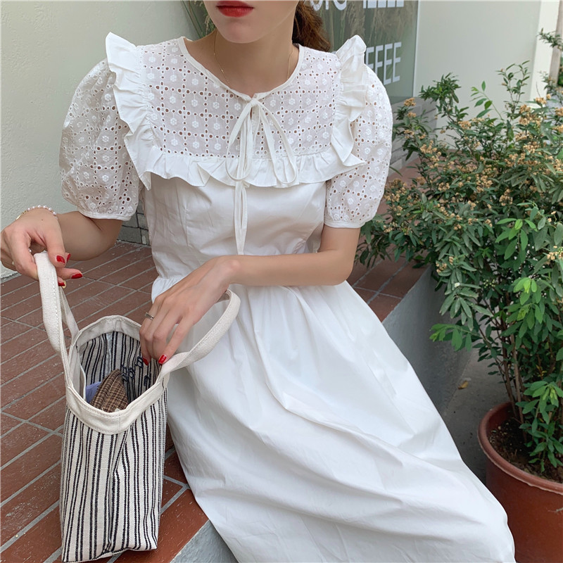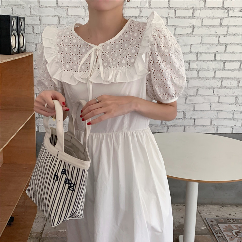 Soft wind cut-out lace dress women's French temperament bubble sleeve waist length black skirt summer