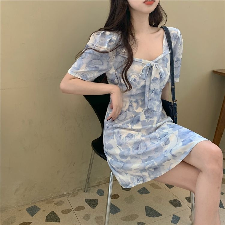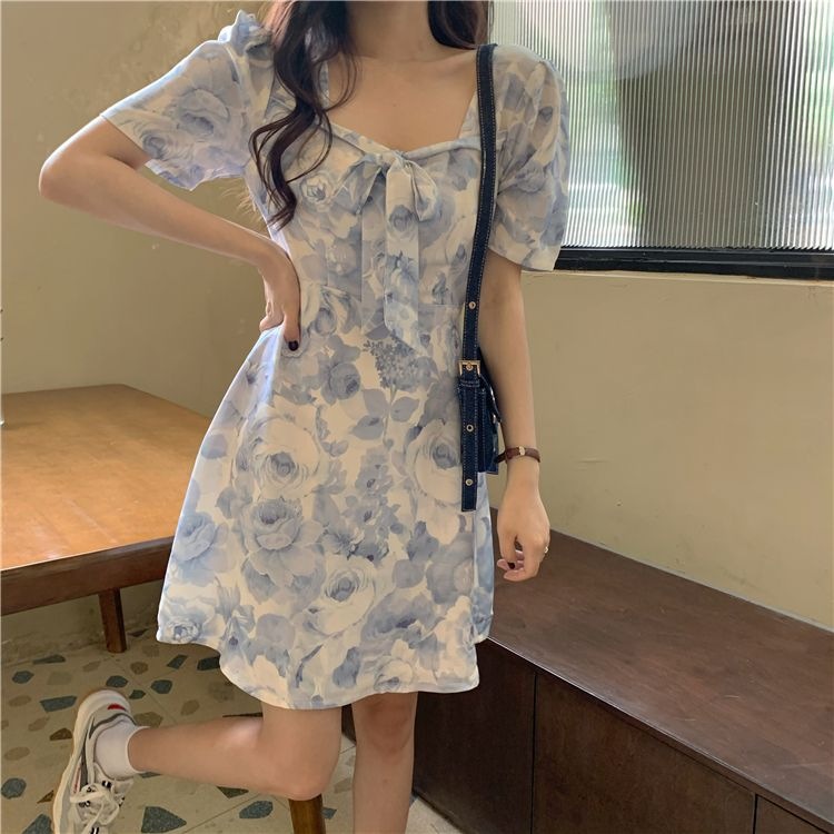Retro oil painting dress women's summer dress new French style waist down with thin temperament